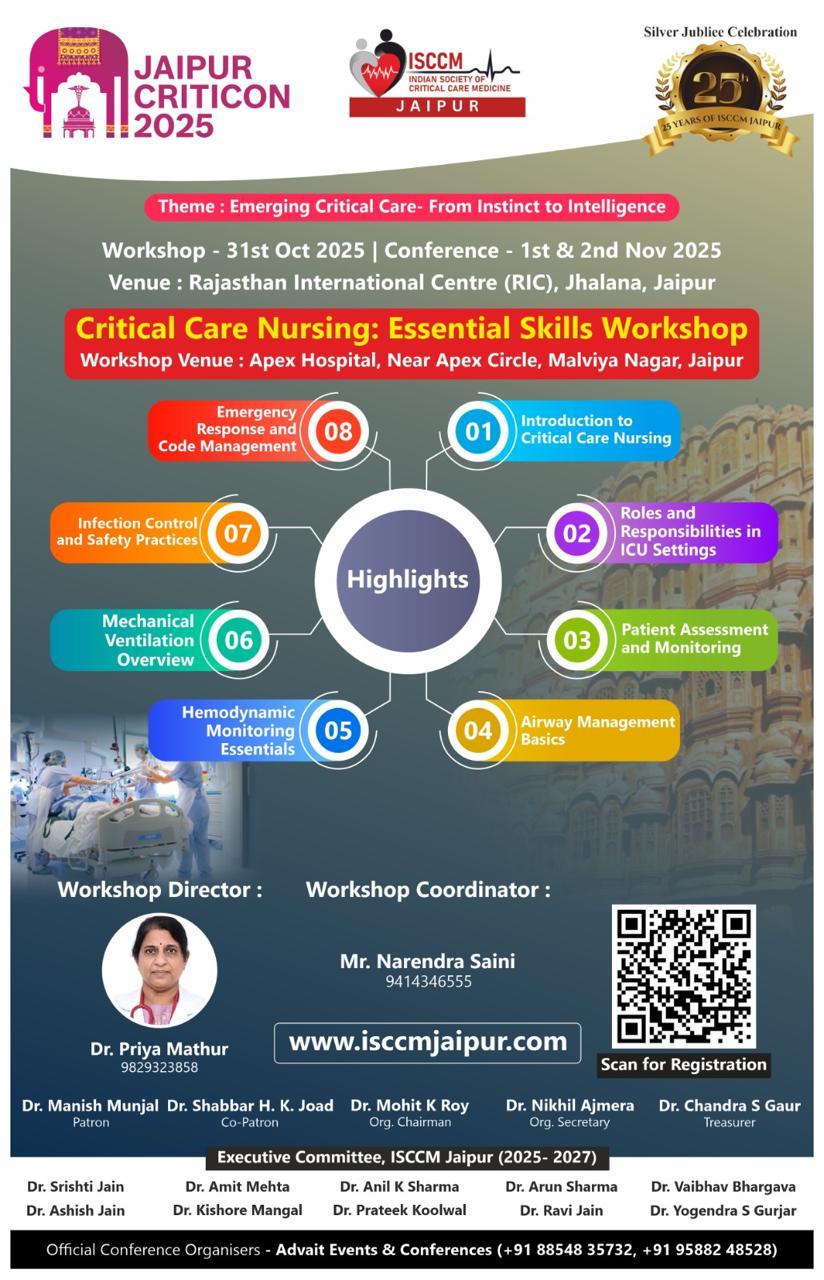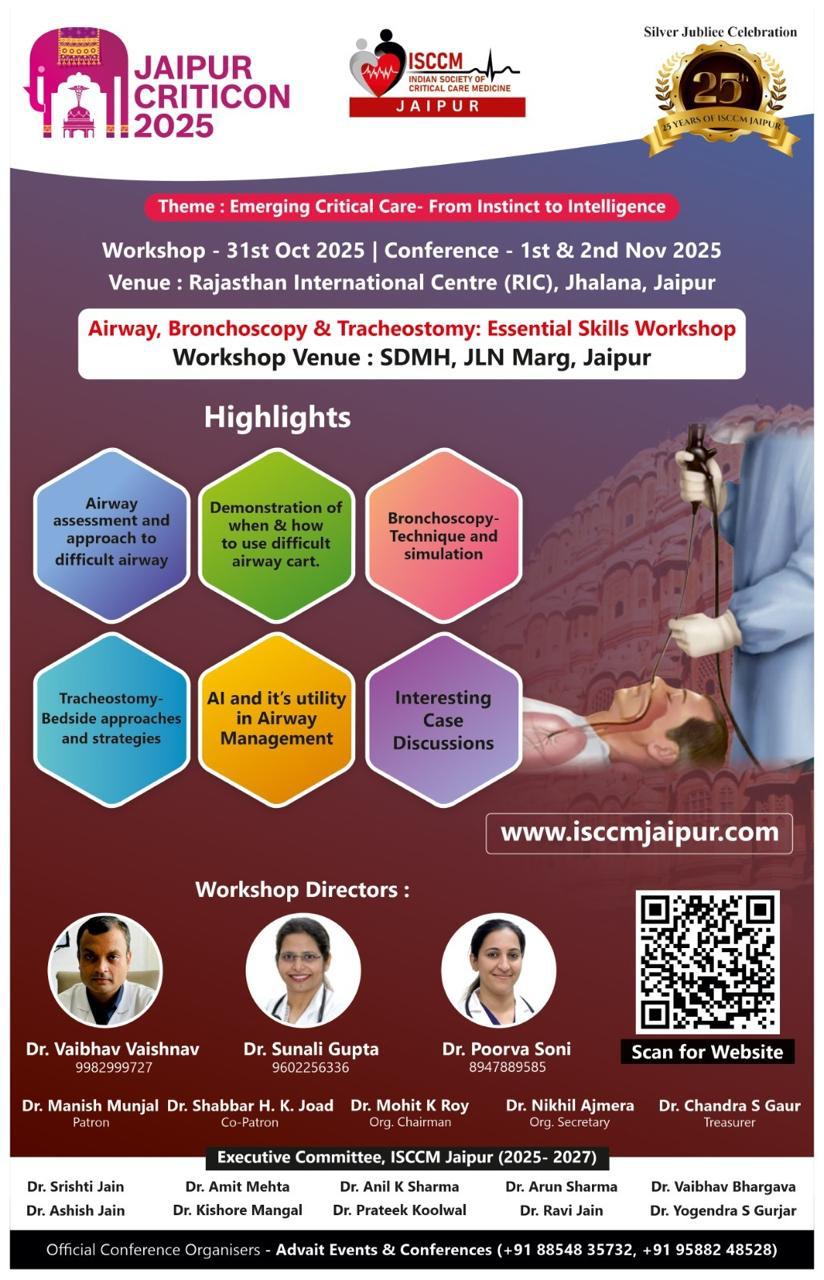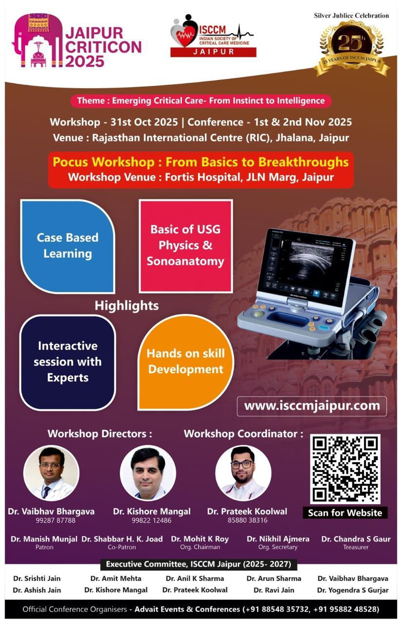 It gives us immense pleasure to extend a cordial welcome to JAIPUR CRITICON 2025 scheduled from 31st October to 2nd November 2025 at the Rajasthan International Centre, Jhalana, Jaipur. The pre-conference workshop is scheduled on 31st October 2025.